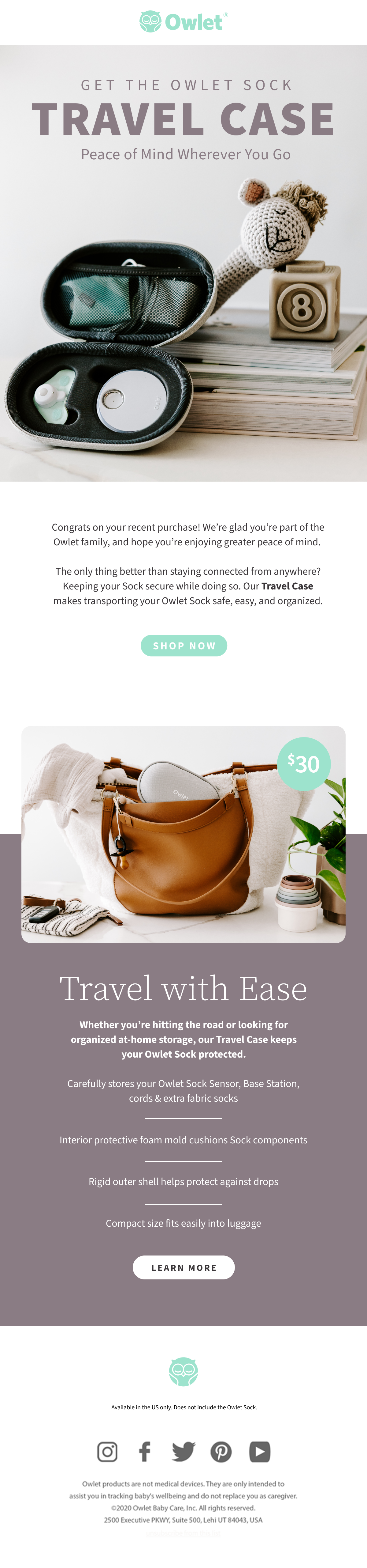 As creative director for Owlet, I led the strategic launch campaign for the new Owlet Travel Case accessory, developed by our product team to meet Smart Sock owners' needs for simpler travel. This convenient case keeps the entire monitoring system organized in one lightweight, protective unit.